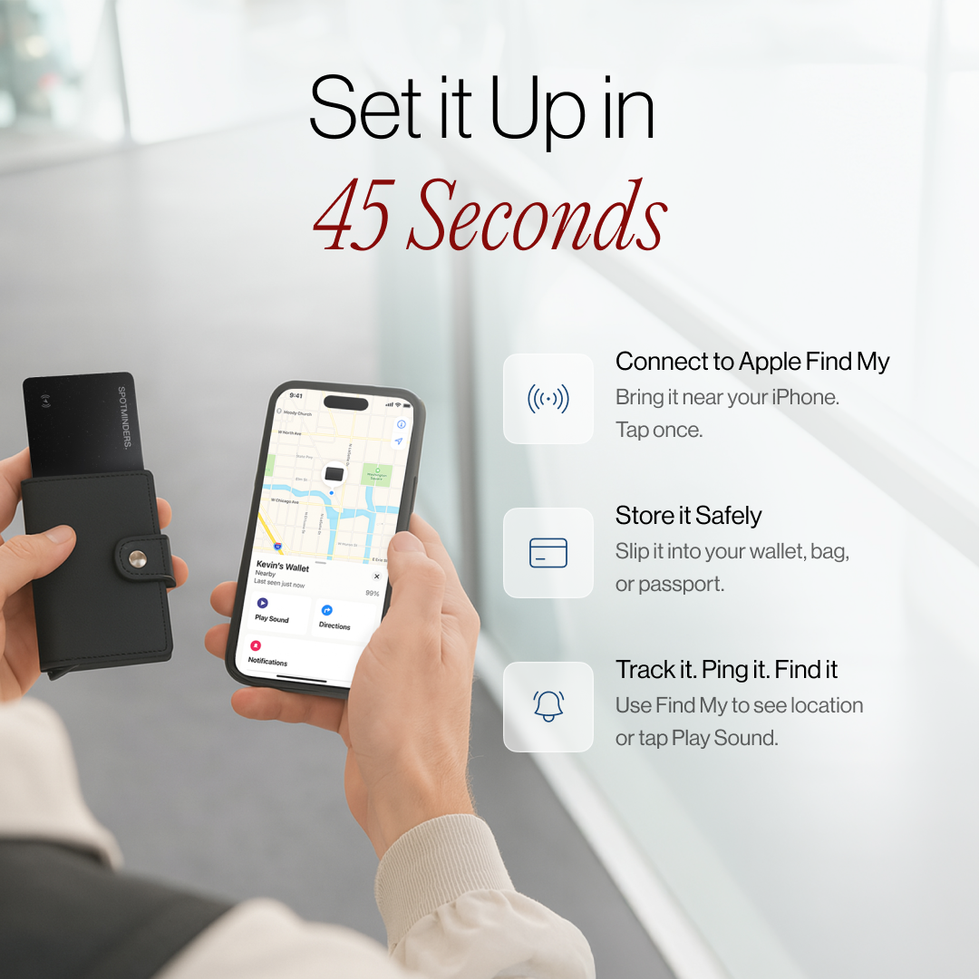 The Spotminders Tracking Card seamlessly integrates with Apple Find My.
