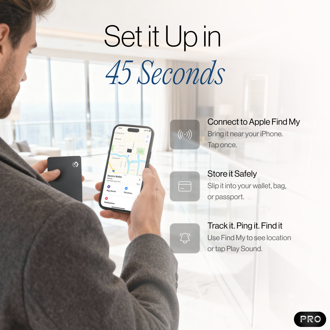No matter where you are, at home or halfway across the world — Apple Find My shows exactly where it is, while the Pro credit-card design stays invisible inside your wallet.