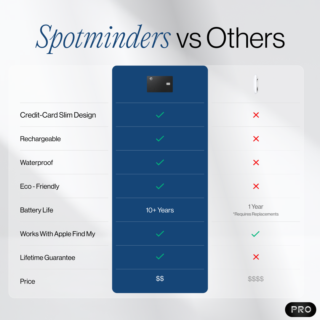 Looks like a credit card. Finds like Spotminders. The stealth upgrade to our best-seller — hidden like a credit card, now with a battery that lasts up to 8 months.