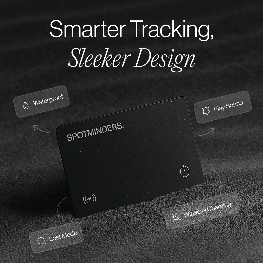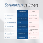 Spotminders Tracking Cards are compatible with standard Qi and MagSafe chargers. Use only certified Spotminder chargers and avoid charging on flammable surfaces. Spotminders is not responsible for damages arising from third-party accessories or improper charging conditions.