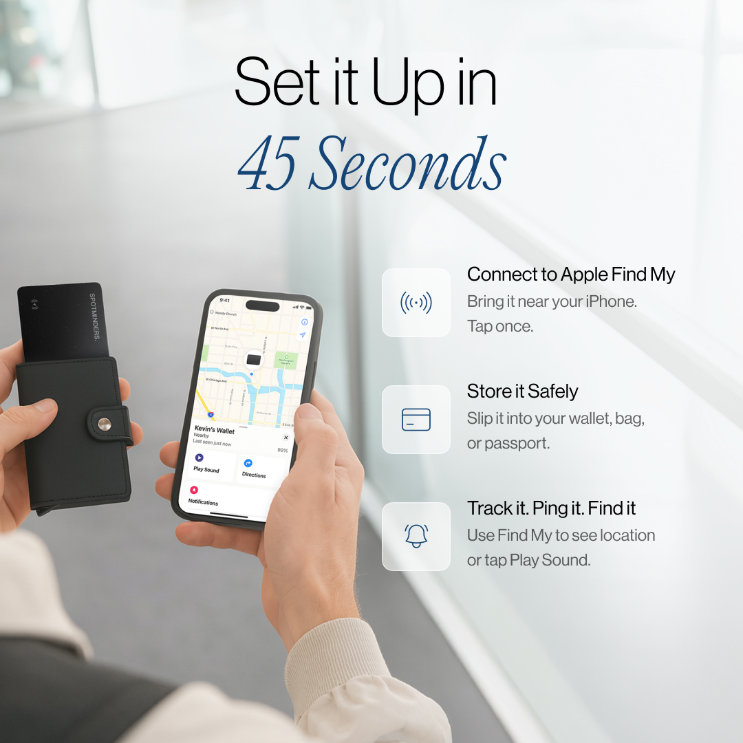 The Spotminders Tracking Card utilizes the Apple Find My Network to seamlessly track your wallet and other essential items. Simply integrate it with your iOS device using the Find My app, and you can easily locate your belongings whenever needed.